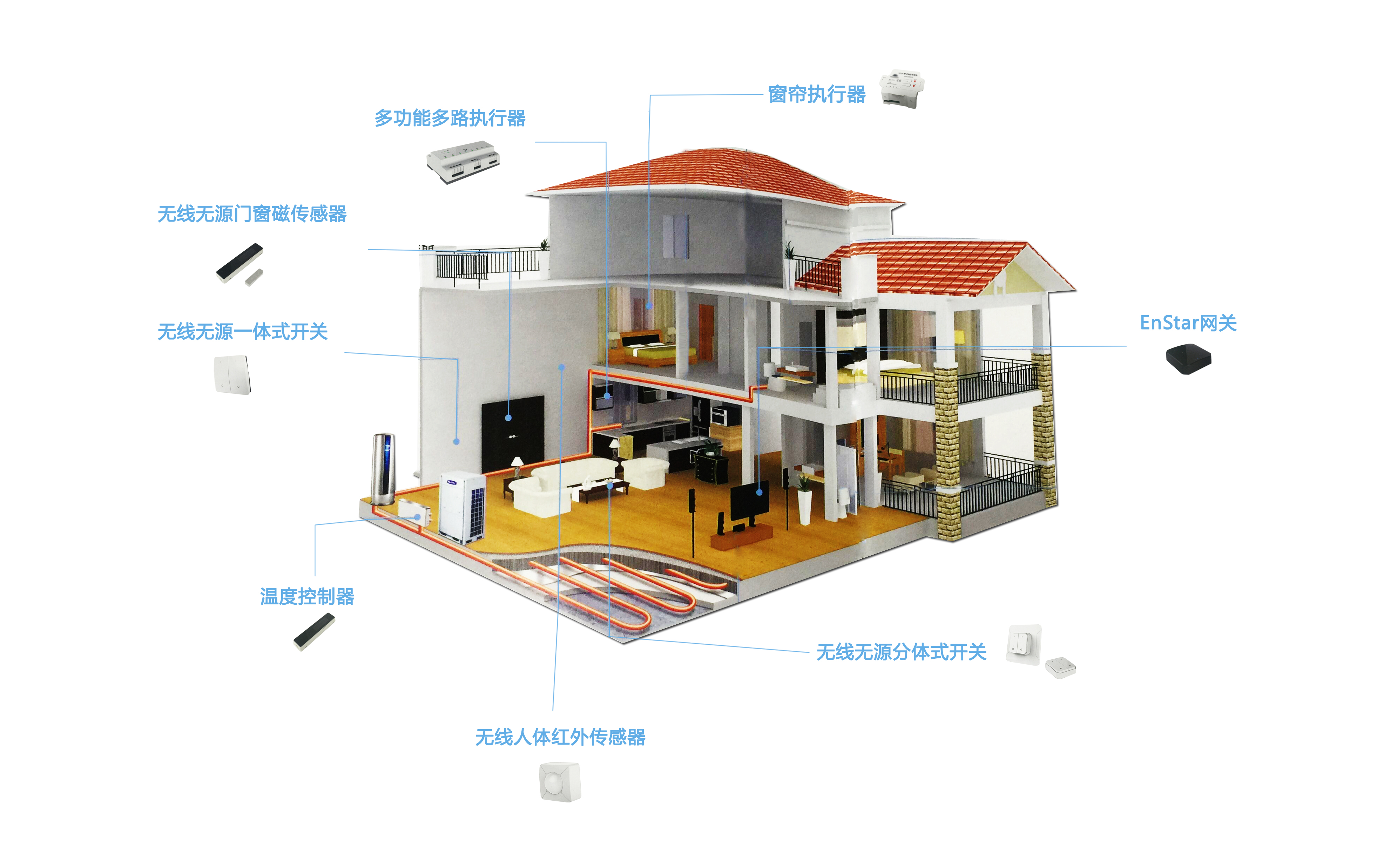 通过无线无源开关,无线控制面板,无线多功能双路控制器,多功能多路控制器可以无线遥控灯光系统,配合可检测光照的人体感应器,实现人来开灯,人走关灯,高照度下自动关灯或调暗灯光,智慧节能。配合手机APP软件可以设定常用模式:会客模式,投影会议模式,家庭影院模式,睡眠模式等,一键操控,方便快捷。